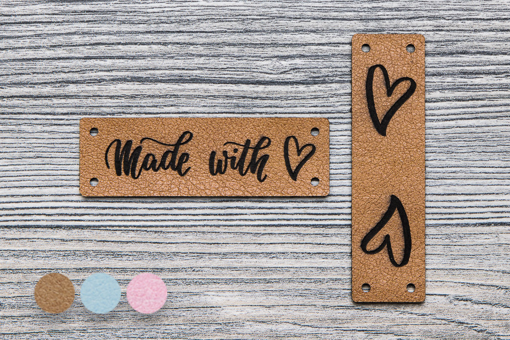 Setti kahta erilaista keinonahkamerkkiä, jotka on valmistettu polyuretaanista ilman haitallisia aineita, soveltuu sisään ommeltavaksi merkiksi käsintehdyille tuotteille, pestävä, vegaaninen.