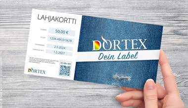 Joten miksipä et tekisi merkkilahjaa? Kuten kaikki tuotteemme, meidän DORTEX lahjakortit voi räätälöidä yksilöllisesti ja muokata luodakseen hyvännäköisen, persoonallisen lahjan. Voit valita haluamasi arvon ja ladata valitsemasi logon tai kuvatiedoston.