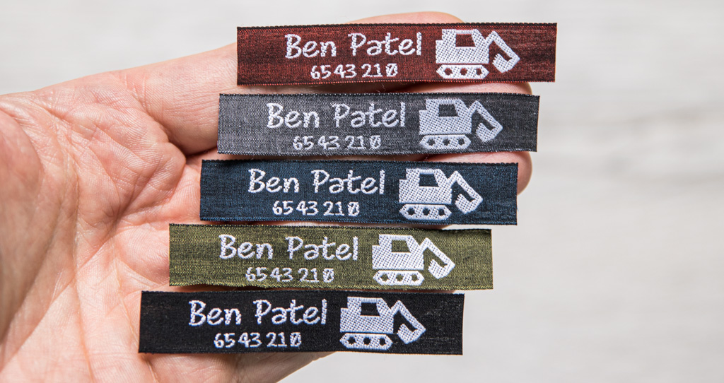 Puhtaasta puuvillasta kudotut etiketit, joihin on kudottu yksilöllisesti suunnittelemasi kuvio. Korkeus 15 mm, 5 klassista väriyhdistelmää.