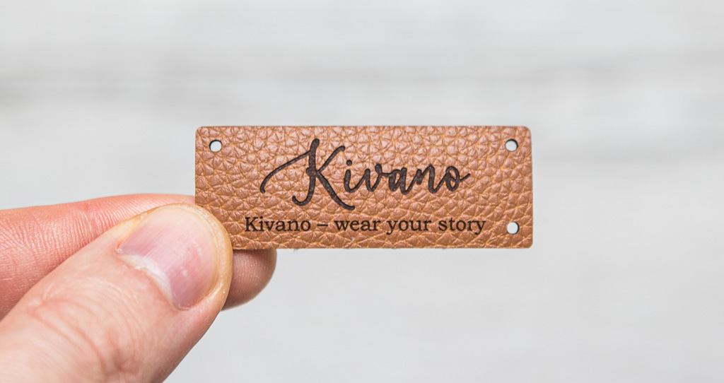 Laserkaiverrettu kasvinahkamerkki, jossa ompelureiät tuotteisiin kiinnitystä varten. Personoi nyt.